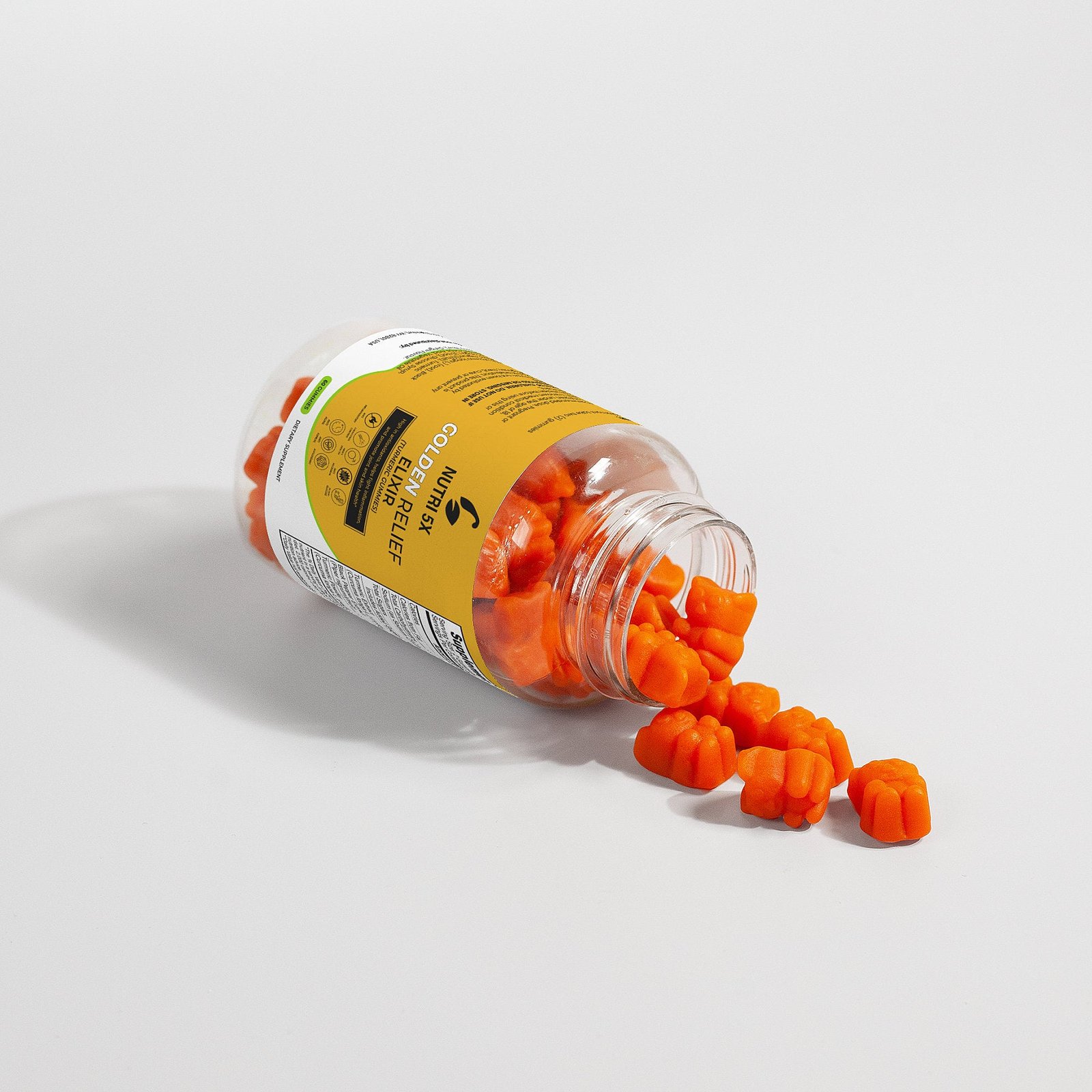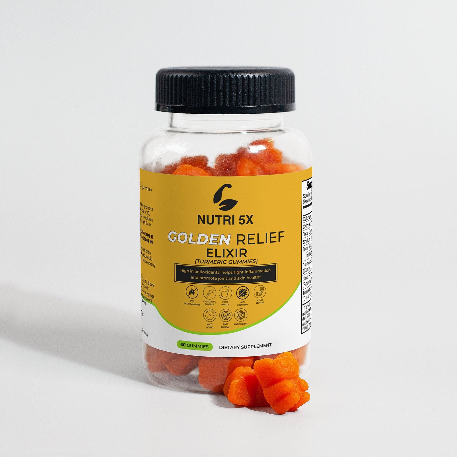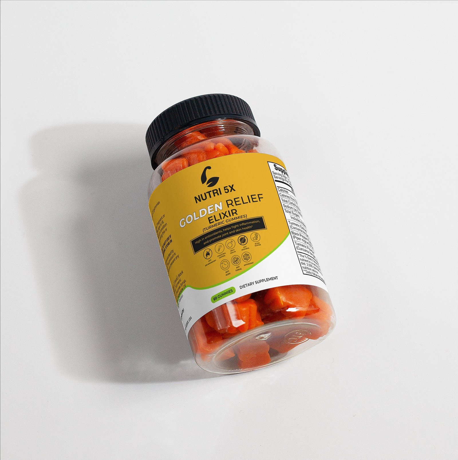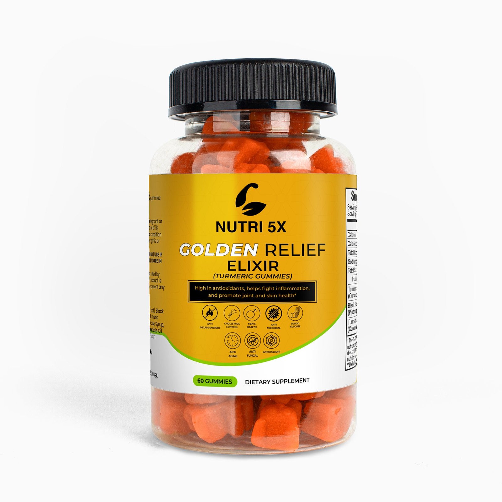 Ingredients of Golden Relief Elixir: Sodium (as Sodium Citrate), Turmeric Extract (Curcuma longa L.)(root), Black Pepper Extract (Piper nigrum)(fruit), Turmeric Powder (Curcuma longa L.)(root), Glucose Syrup, Sugar, Glucose, Pectin, Citric Acid, Vegetable Oil, (contains Carnauba Wax), Ginger Flavor.